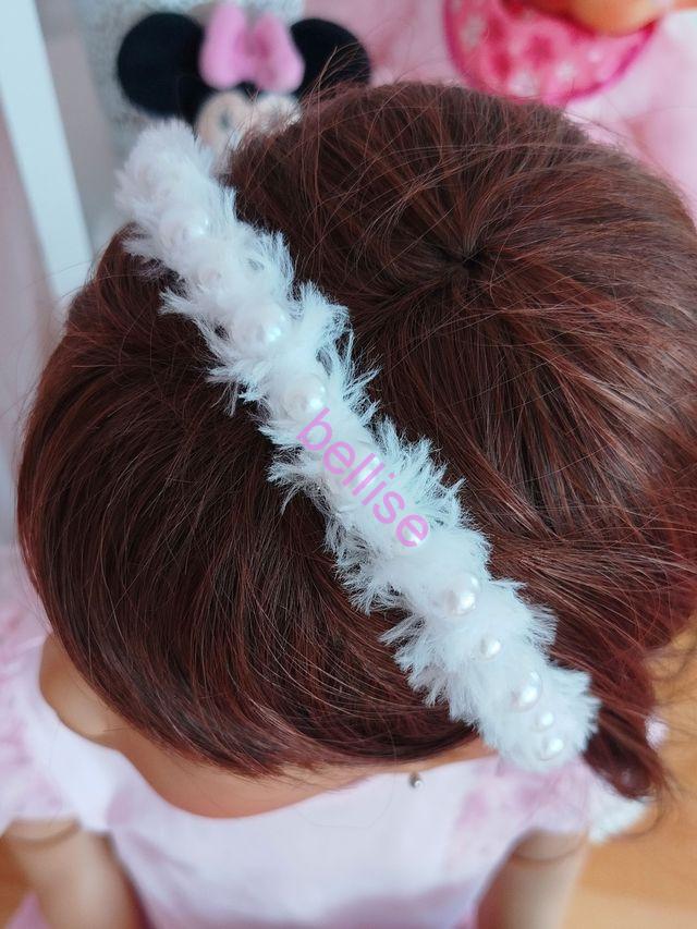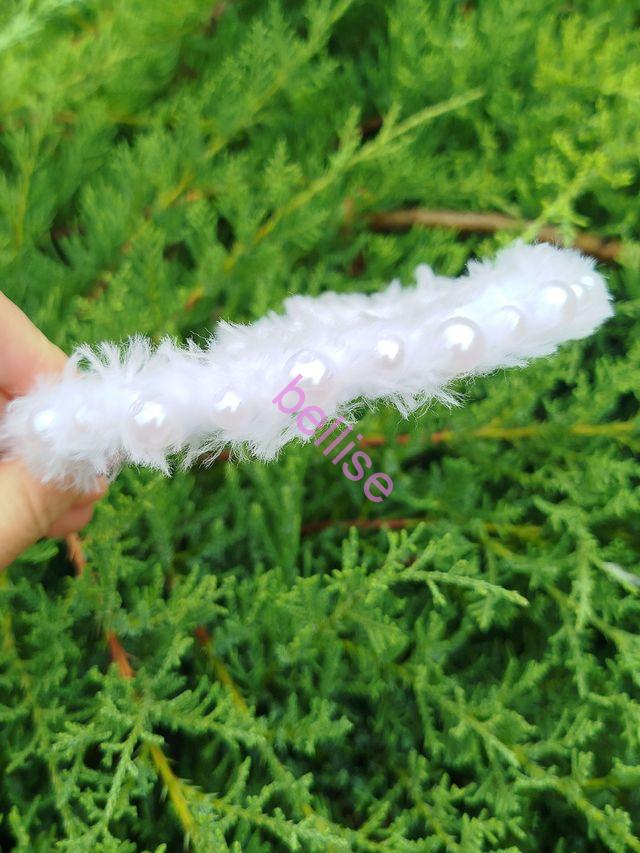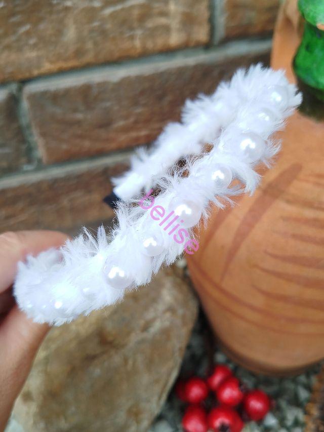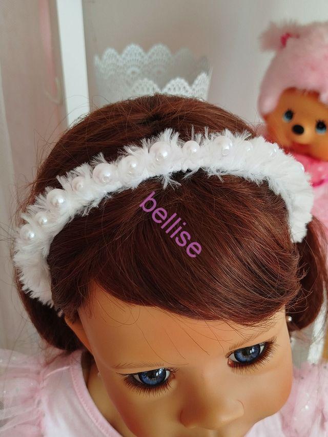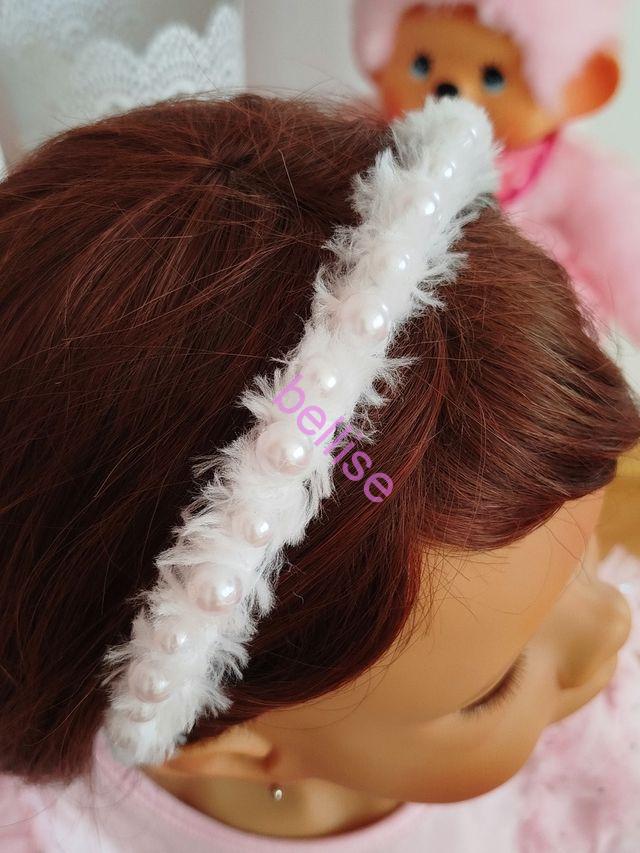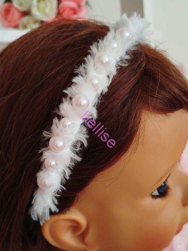 Biela čelenka je zdobená perličkami, je vhodná aj pre menšie dievčatká, nakoľko netlačí na uškách.