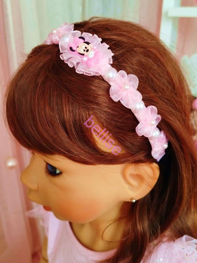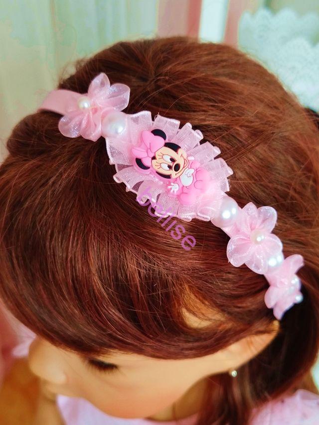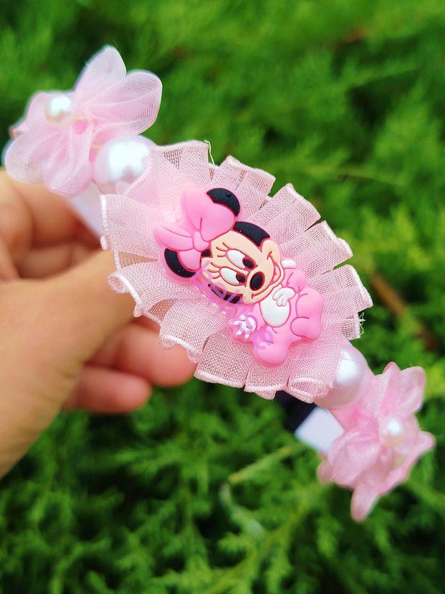 Jemne ružová čelenka je zdobená kvietkami, perličkami a postavičkou Minnie.