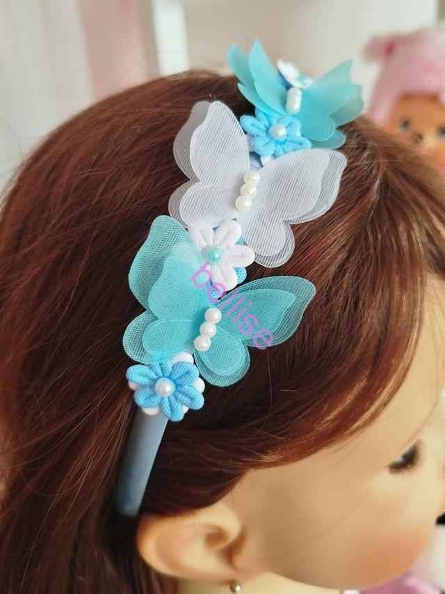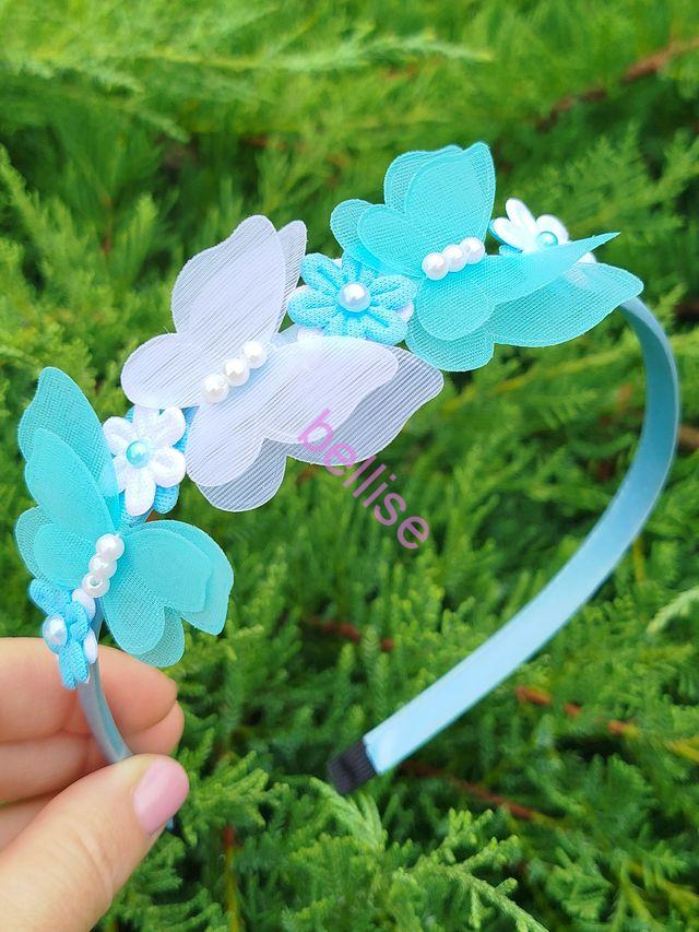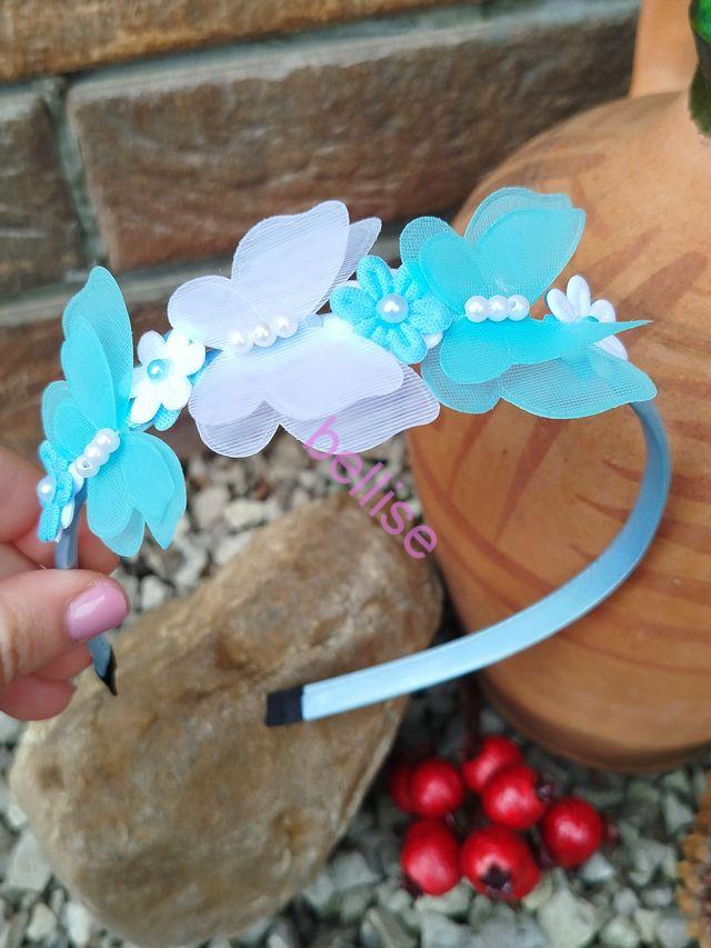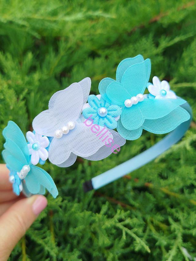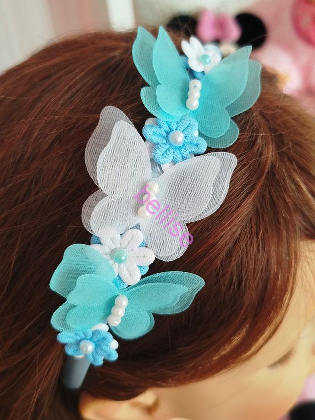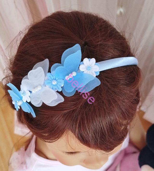 Modrá saténová čelenka je zdobená motýlikami a kvietkami, je vhodná aj pre menšie dievčatká, nakoľko netlačí na uškách.