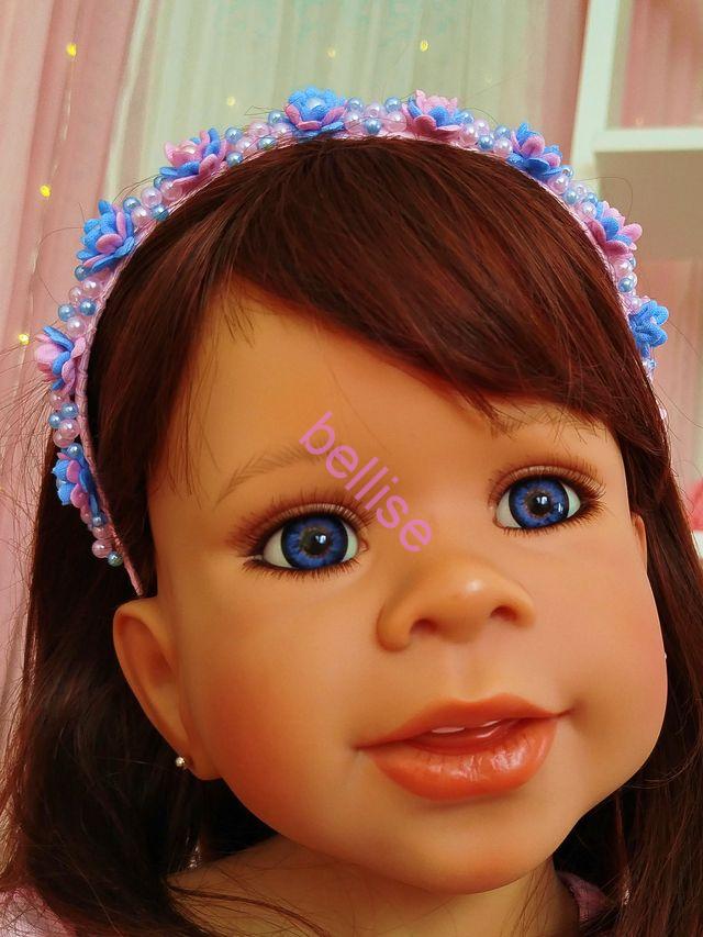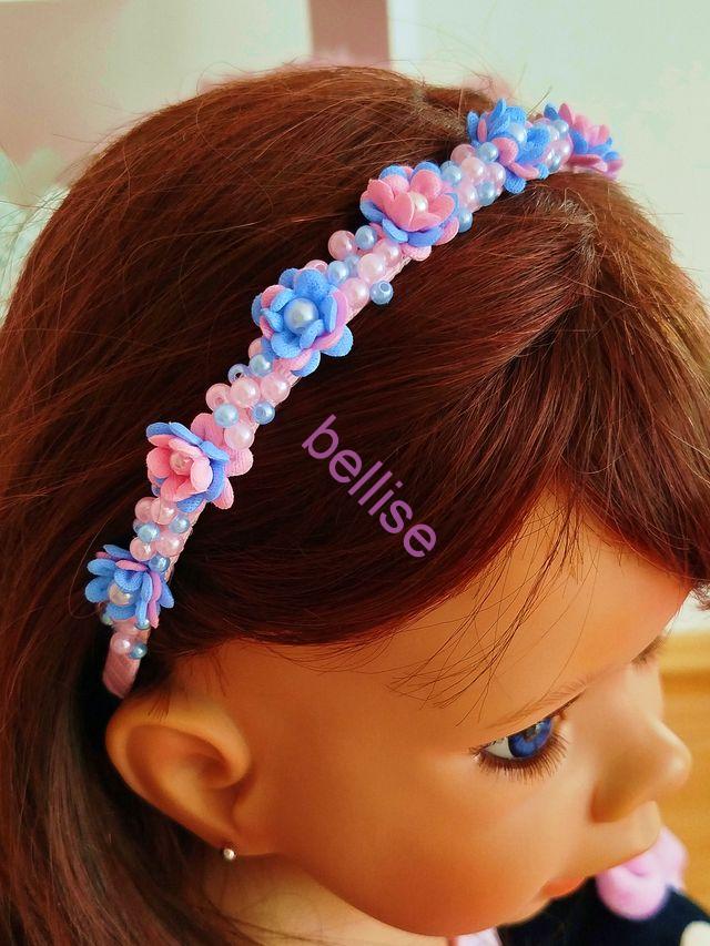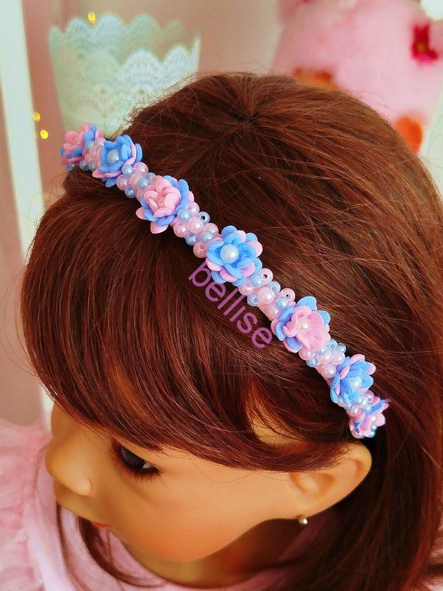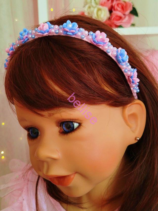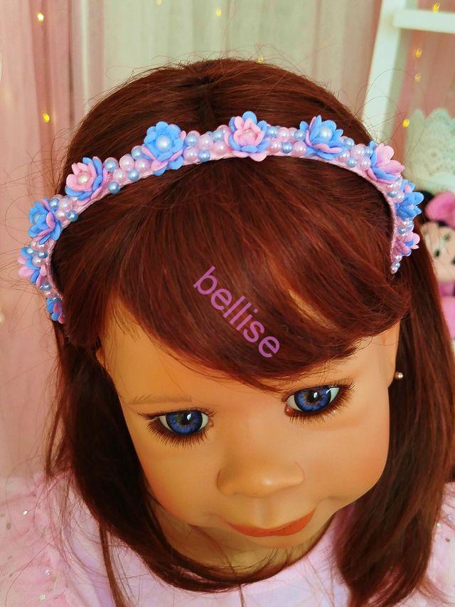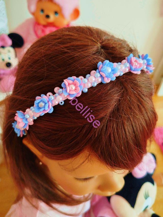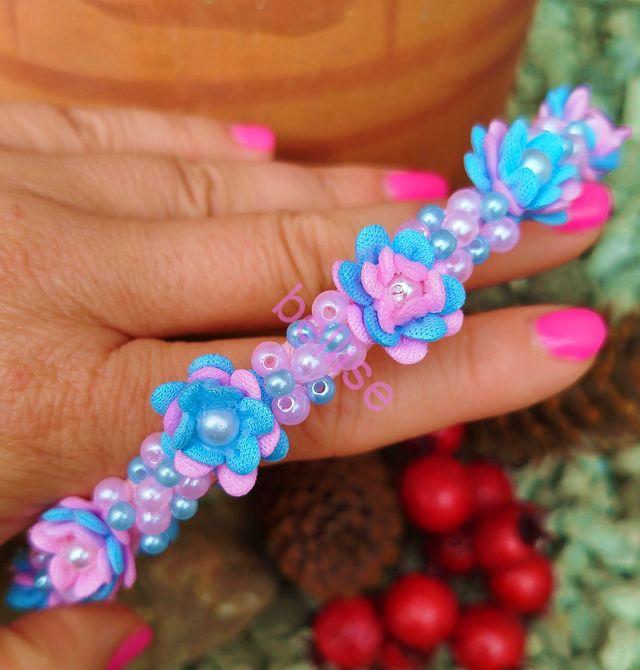 Prekrásna čelenka v ružovo-modrej kombinácii je zdobená perličkami a 3D kvietkami.