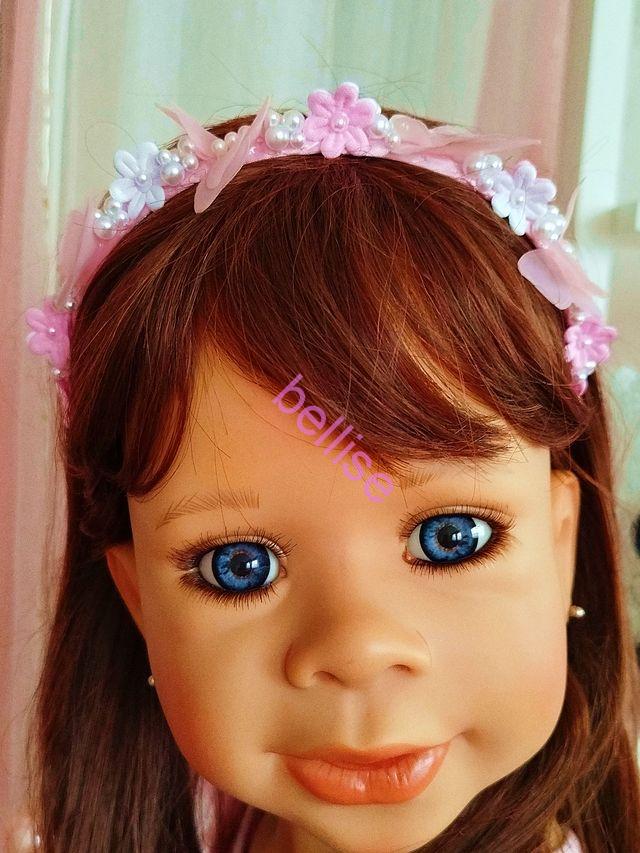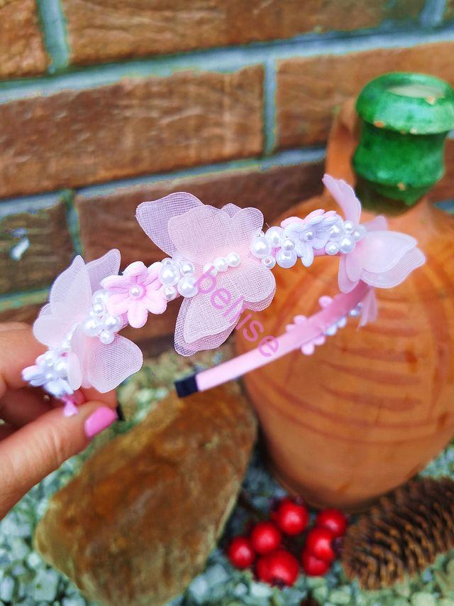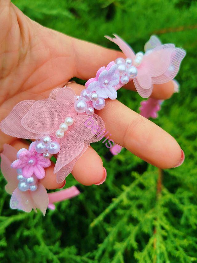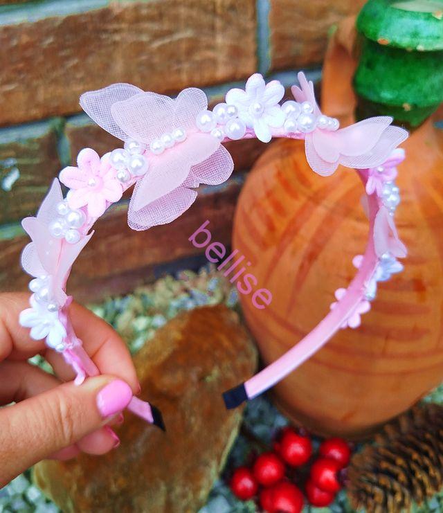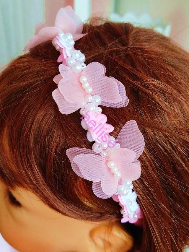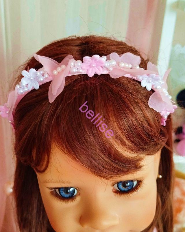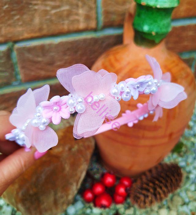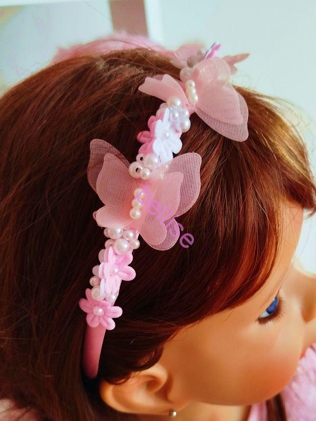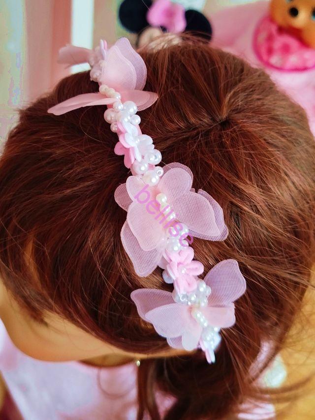 Ružová čelenka je zdobená kvietkami, motýlikami a perličkami, je vhodná aj pre menšie dievčatká, nakoľko netlačí na uškách.
