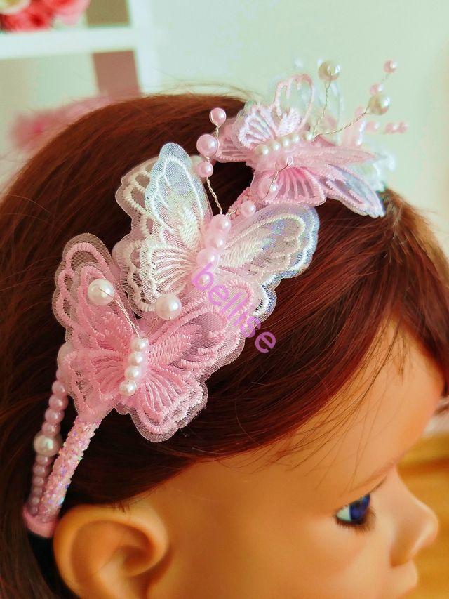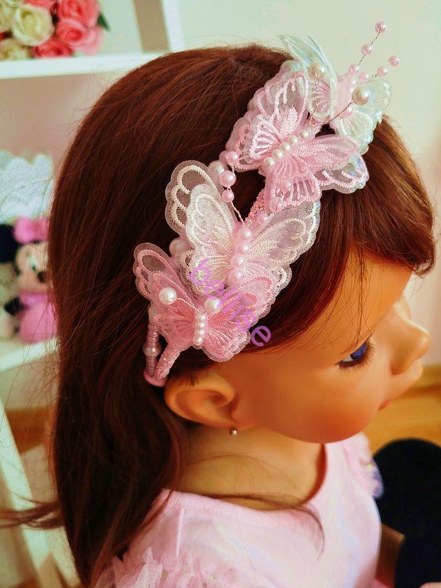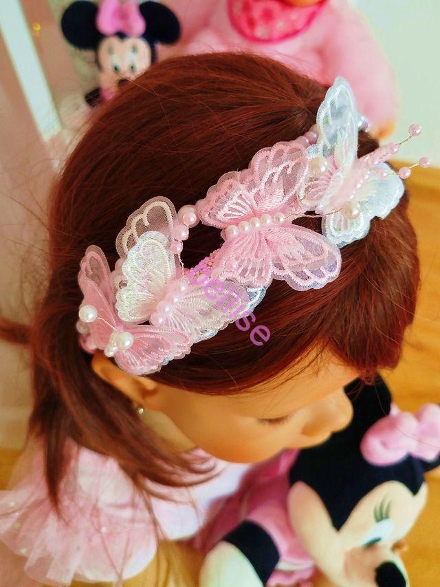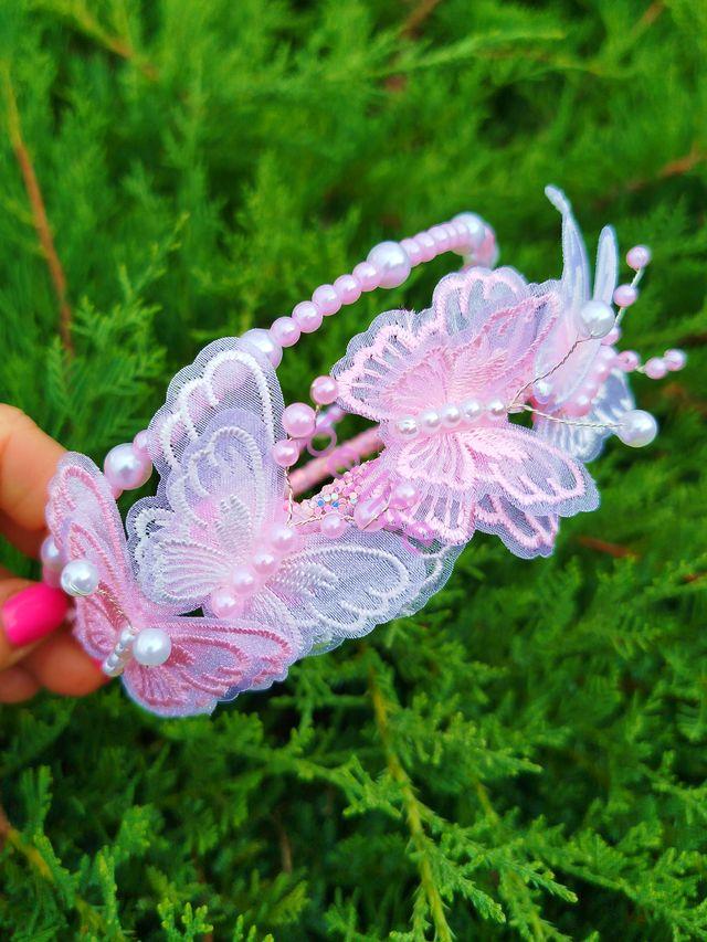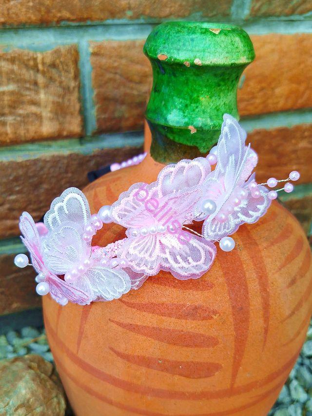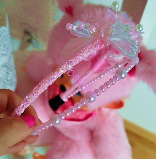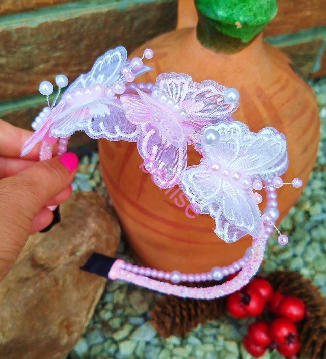 Dvojradová čelenka v bielo-ružovej kombinácii je zdobená perličkami a motýlikmi.