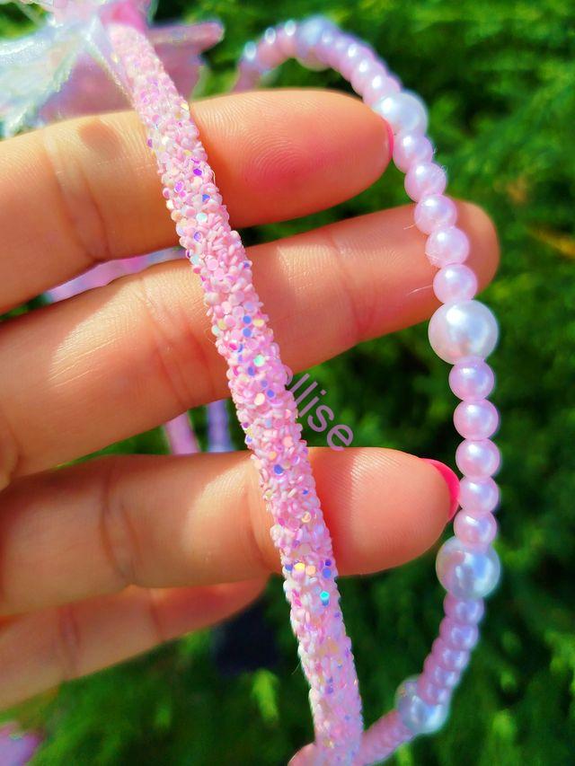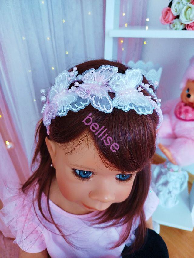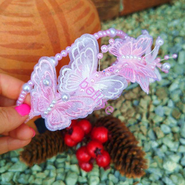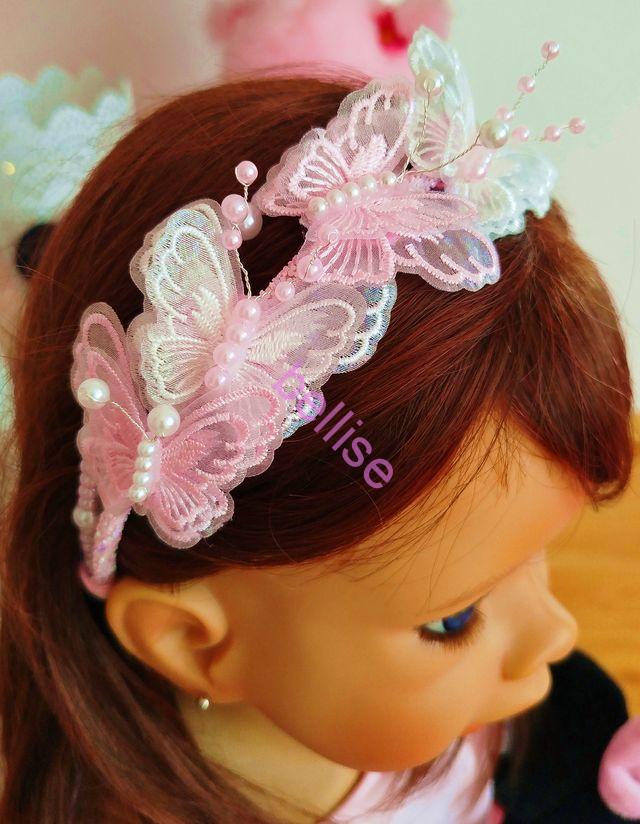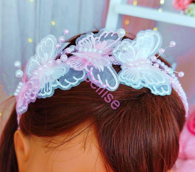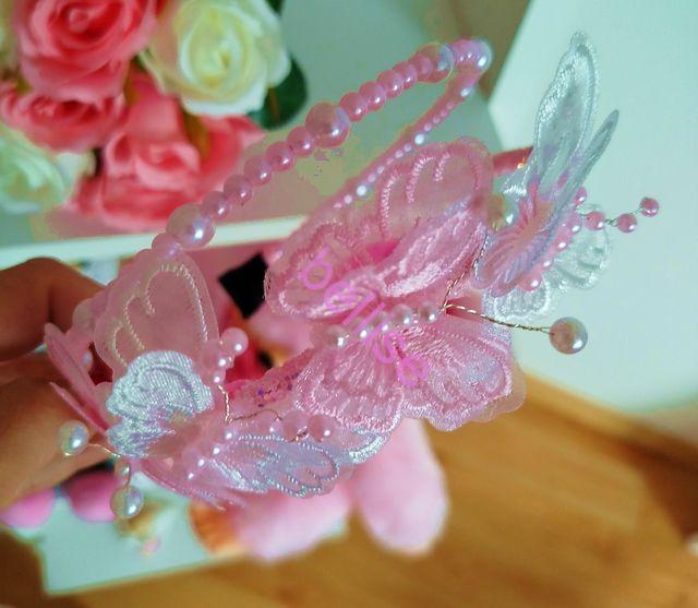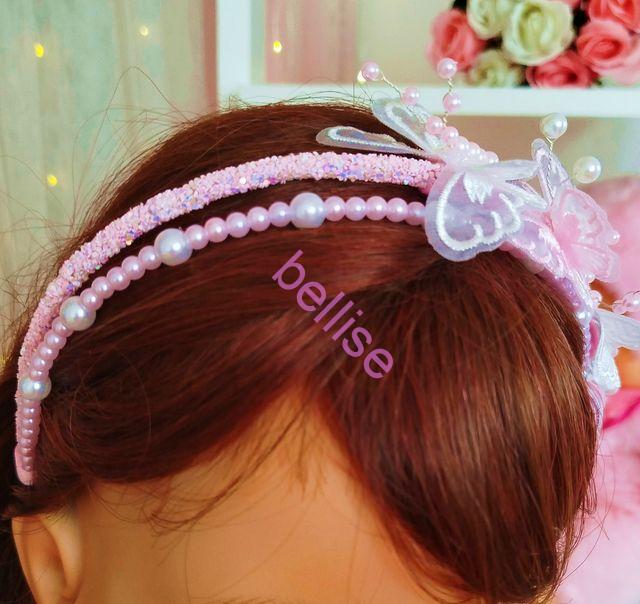Dvojradová čelenka v bielo-ružovej kombinácii je zdobená perličkami a motýlikmi.