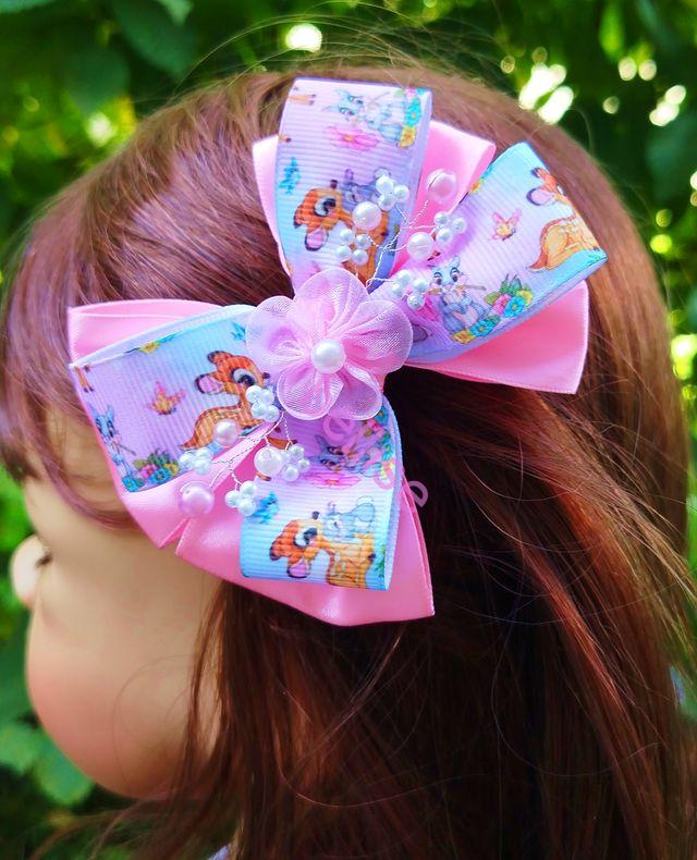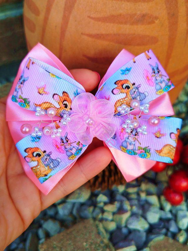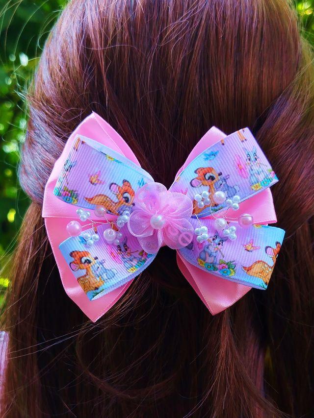 Roztomilá mašla v ružovej farbe doplnená motívom bambi a dozdobená perličkami a kvietkom.