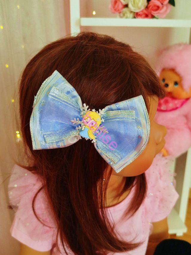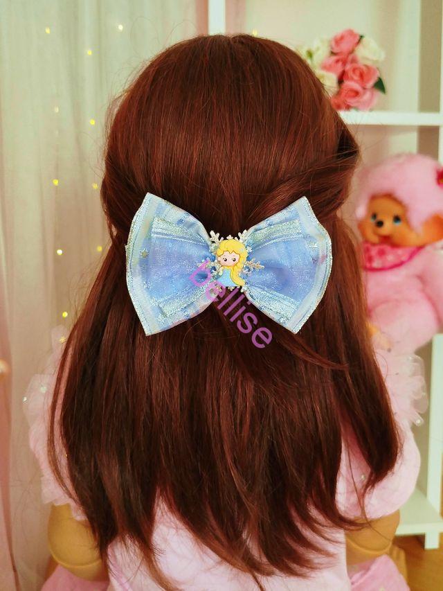Modrá mašľa do vlasov je zdobená vločkou a princezničkou.