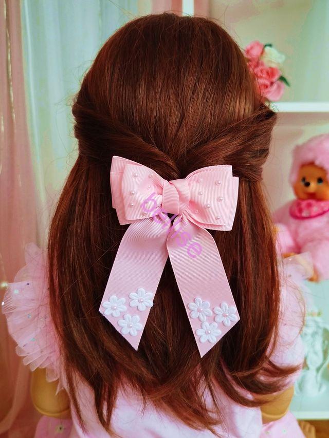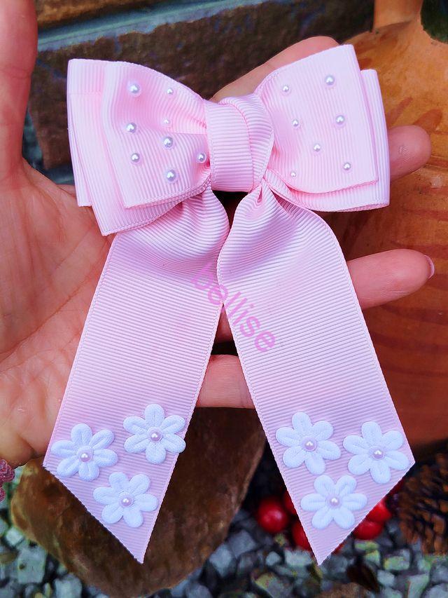 Jemne ružová mašlička je zdobená perličkami a kvietkami, celková dľžka je cca 14 cm
