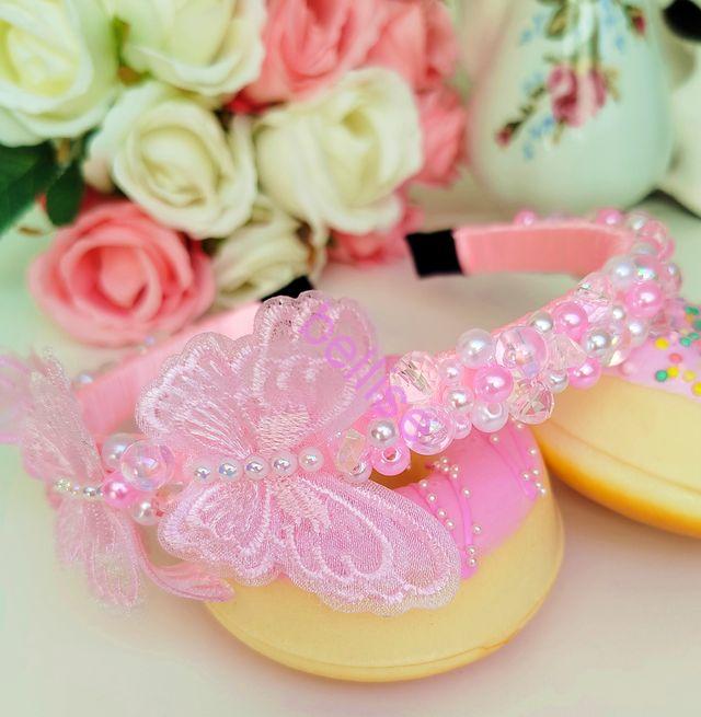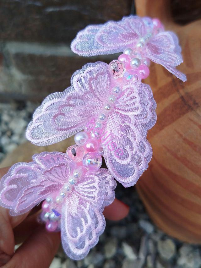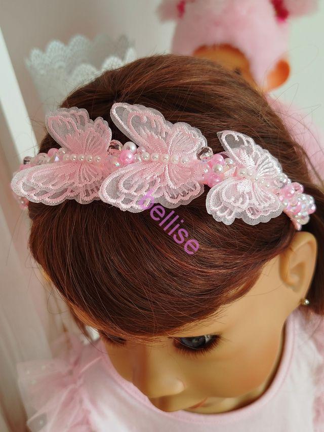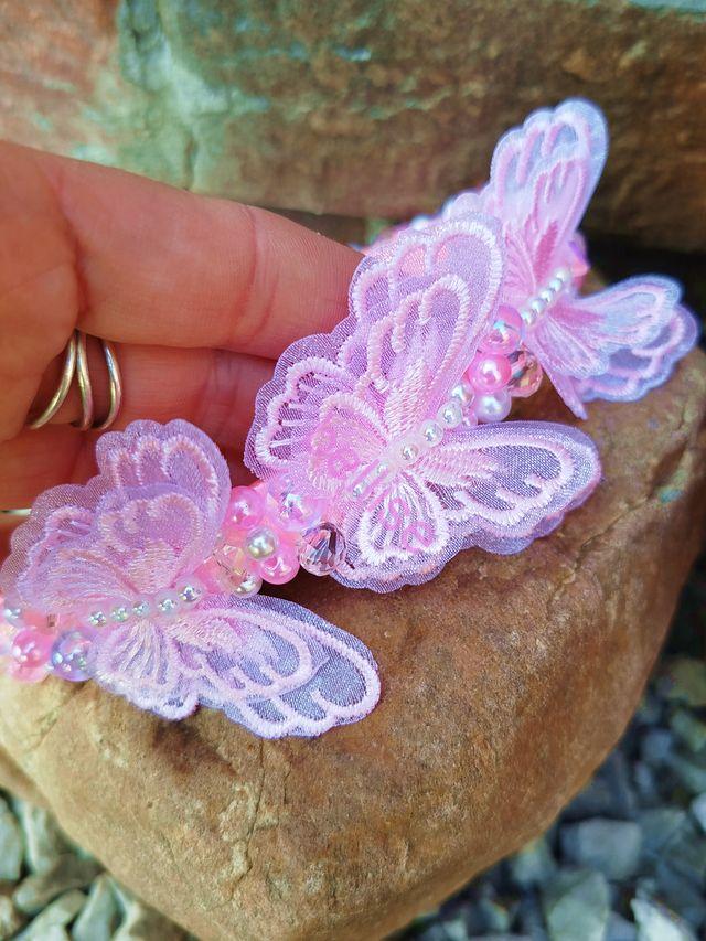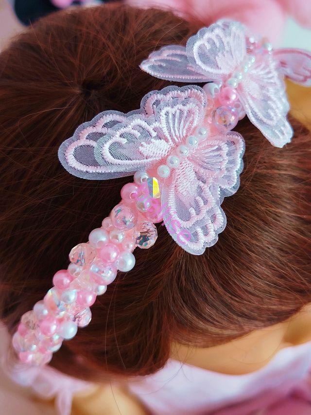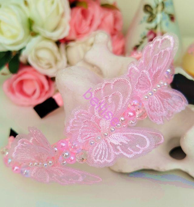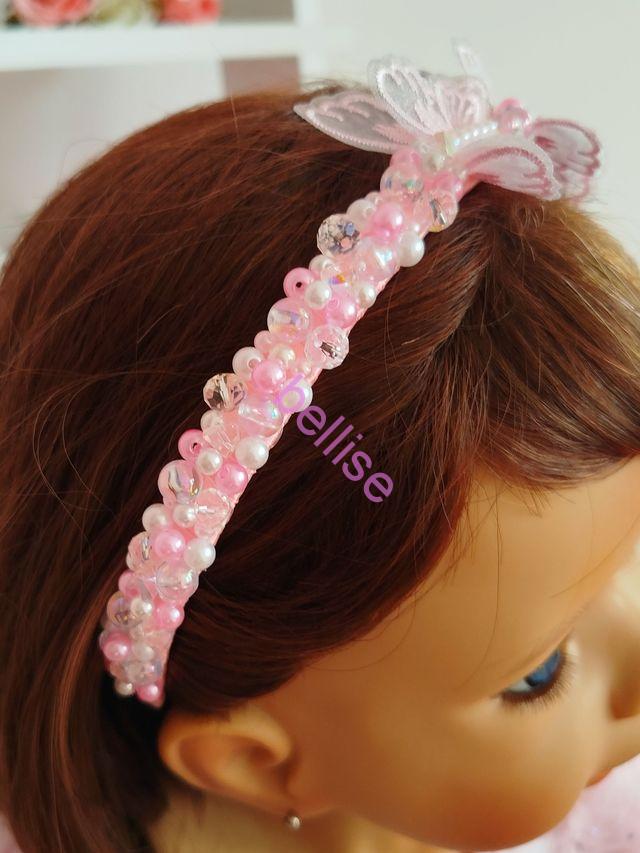 Ružová čelenka je zdobená plastovými a sklenenými korálkami a je doplnená motýlikami.