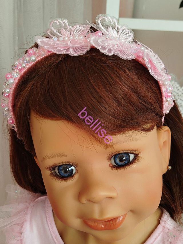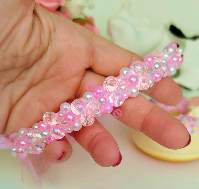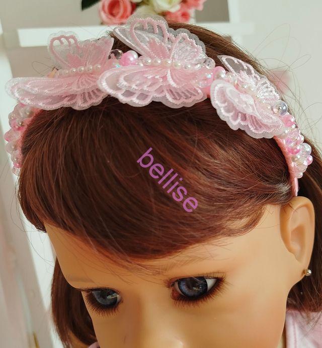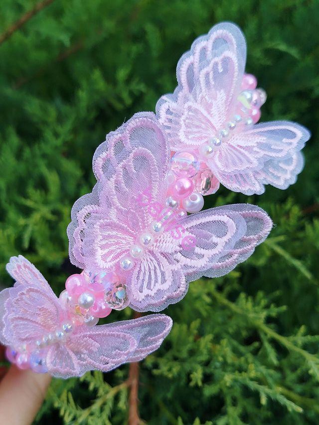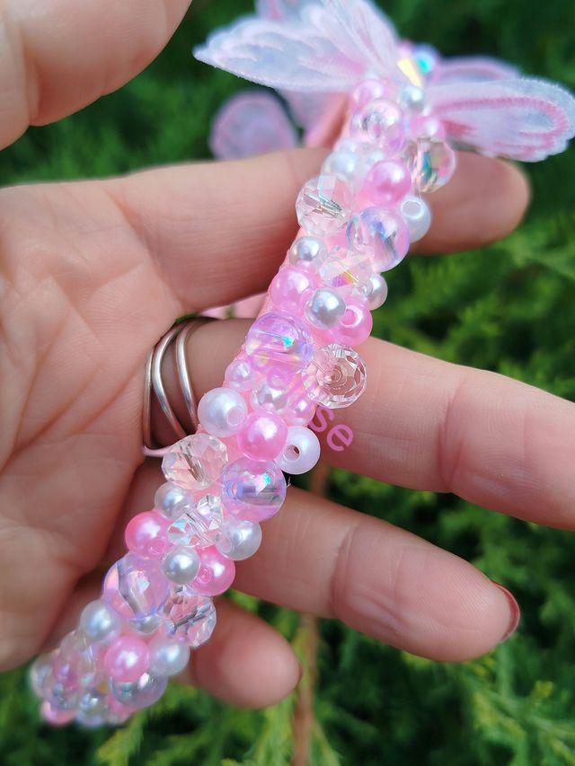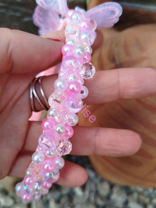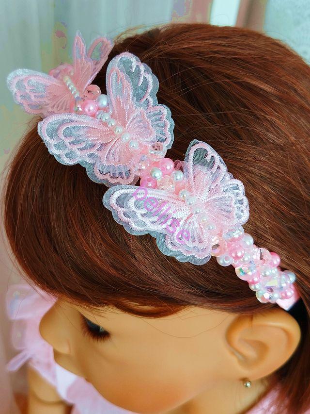 Ružová čelenka je zdobená plastovými a sklenenými korálkami a je doplnená motýlikami.