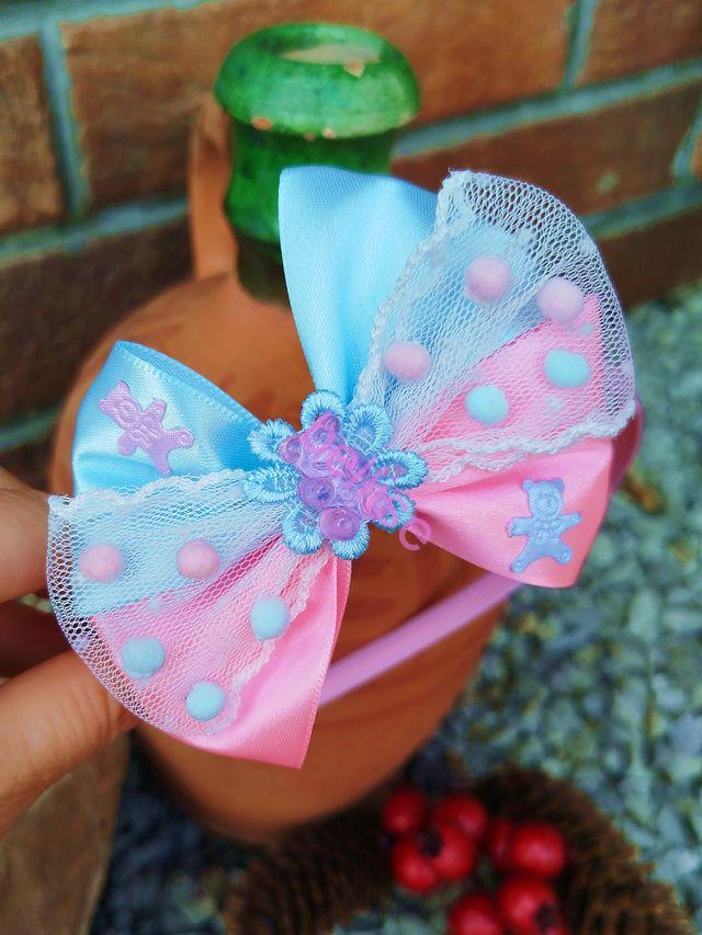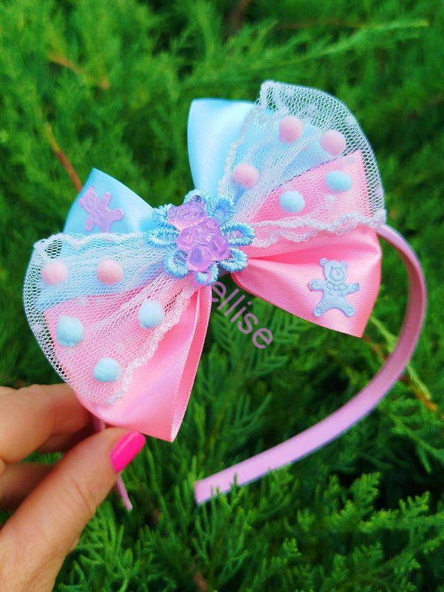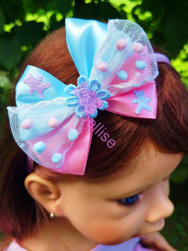 Ružová saténová čelenka je zdobená mašľou v ružovo-modrej kombinácii, čelenka je vhodná aj pre menšie detičky nakoľko netlačí na uškách.